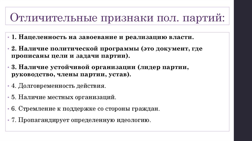 • Отличительные признаки политических партий.