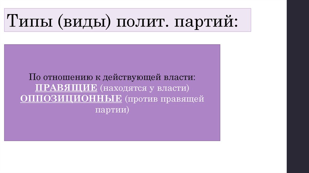 Типы (виды) полит. партий:По отношению к действующей власти: