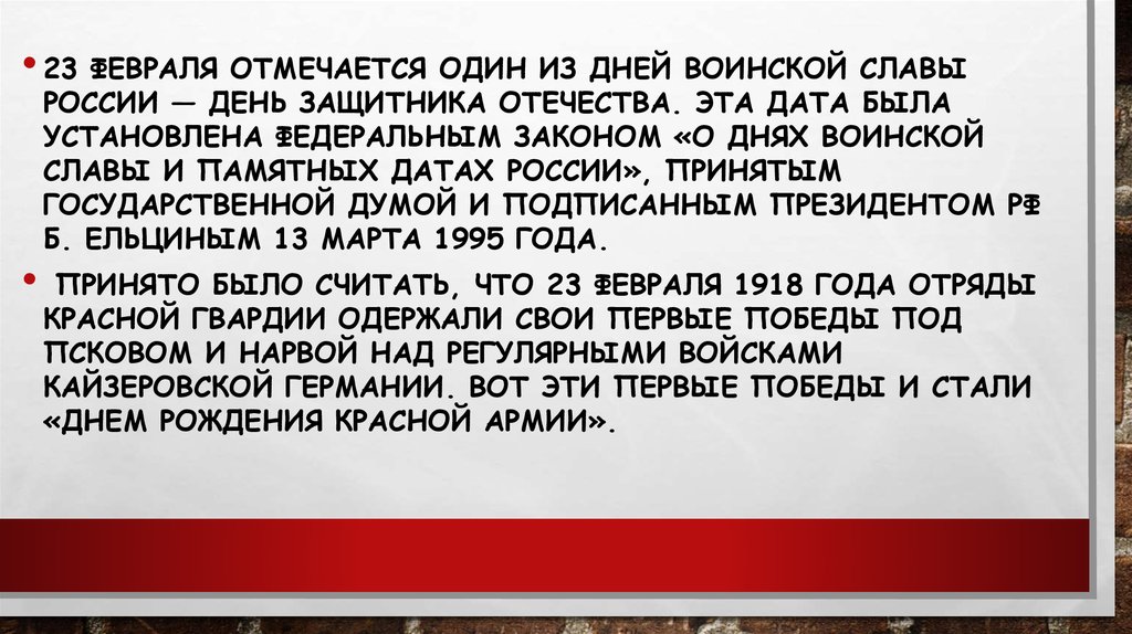• 23 ФЕВРАЛЯ ОТМЕЧАЕТСЯ ОДИН ИЗ ДНЕЙ ВОИНСКОЙ СЛАВЫРОССИИ — ДЕНЬ ЗАЩИТНИКА ОТЕЧЕСТВА. ЭТА ДАТА БЫЛА