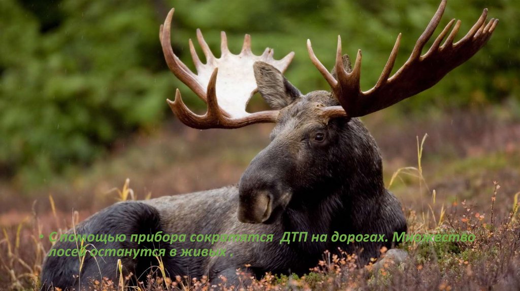• Чтобы спасти лосей мы придумали робота , который отпугивает лосей.Прибор располагается на месте где часто ходят лоси. Звуки которые издает