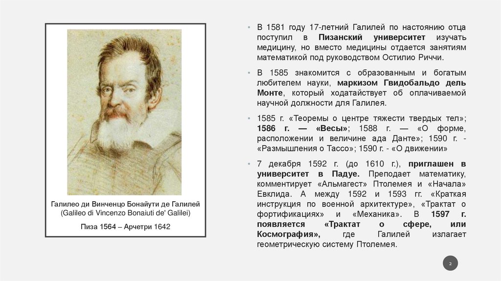 • В 1581 году 17-летний Галилей по настоянию отцапоступил в Пизанский университет изучать