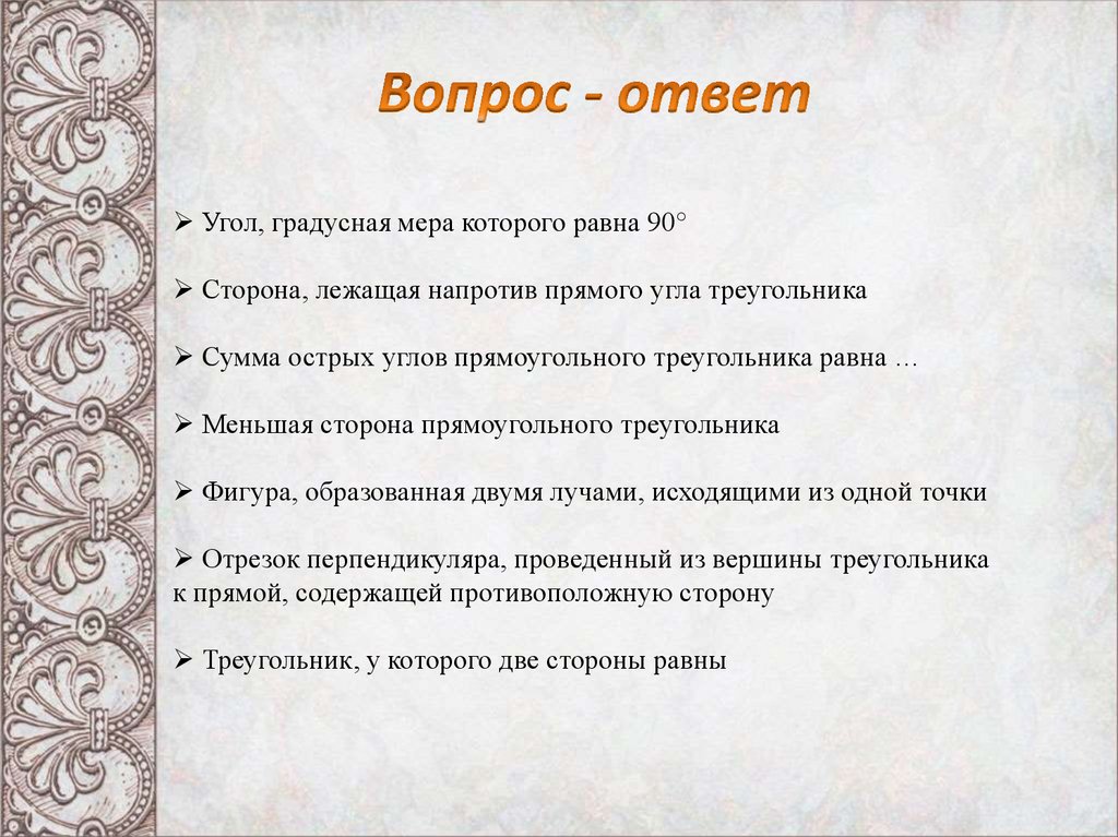 Угол, градусная мера которого равна 90°Сторона, лежащая напротив прямого угла треугольника