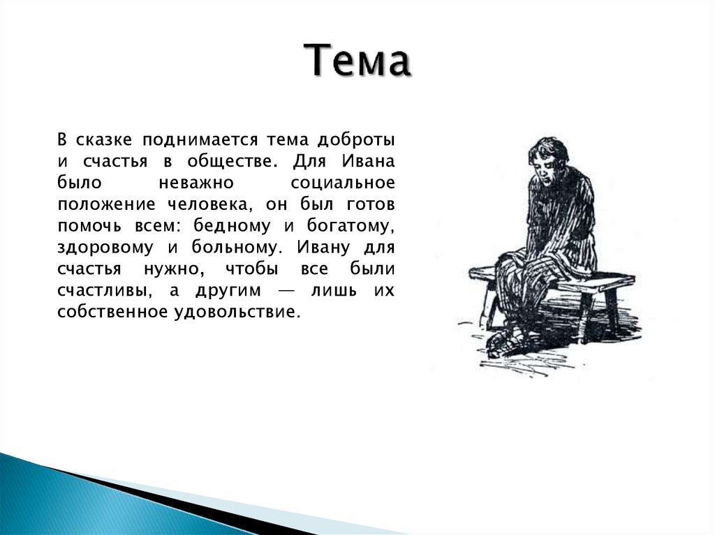 В сказке поднимается тема добротыи счастья в обществе. Для Ивана
