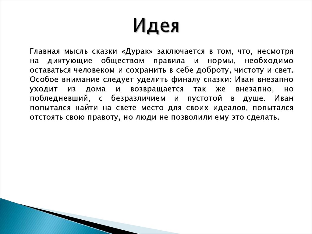 Главная мысль сказки «Дурак» заключается в том, что, несмотряна диктующие обществом правила и нормы, необходимо