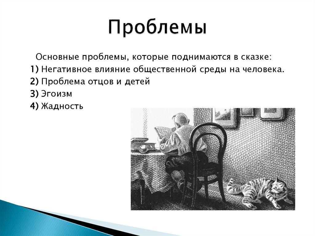 Основные проблемы, которые поднимаются в сказке:1) Негативное влияние общественной среды на человека.