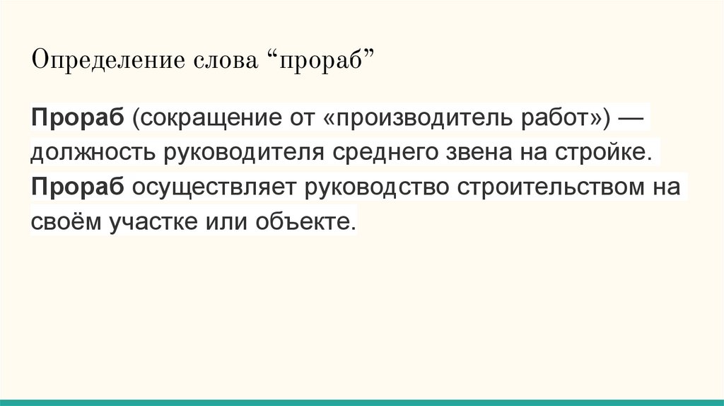 Определение слова “прораб”Прораб (сокращение от «производитель работ») —