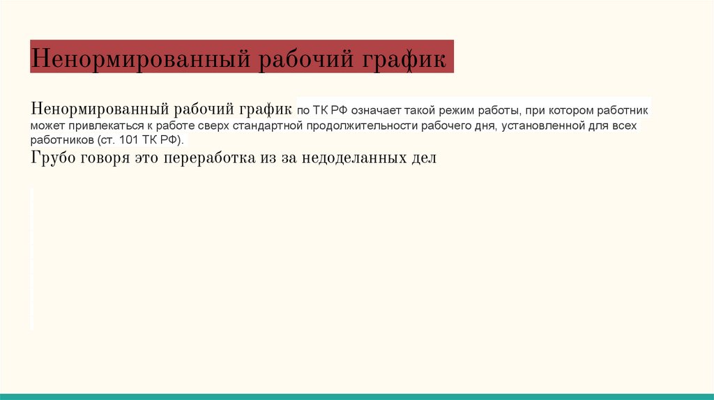 Ненормированный рабочий графикНенормированный рабочий график по ТК РФ означает такой режим работы, при котором работник