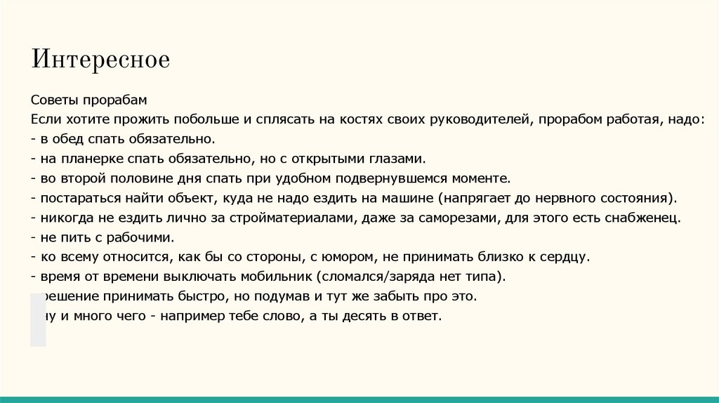 Если хотите прожить побольше и сплясать на костях своих руководителей, прорабом работая, надо: