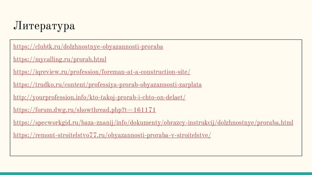 Литератураhttps://clubtk.ru/dolzhnostnye-obyazannosti-proraba