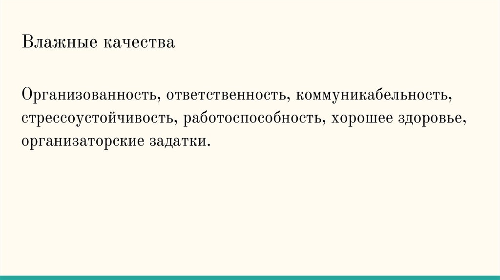 Влажные качестваОрганизованность, ответственность, коммуникабельность,