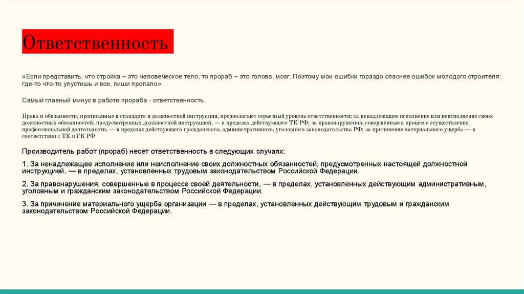 Производитель работ (прораб) несет ответственность в следующих случаях: