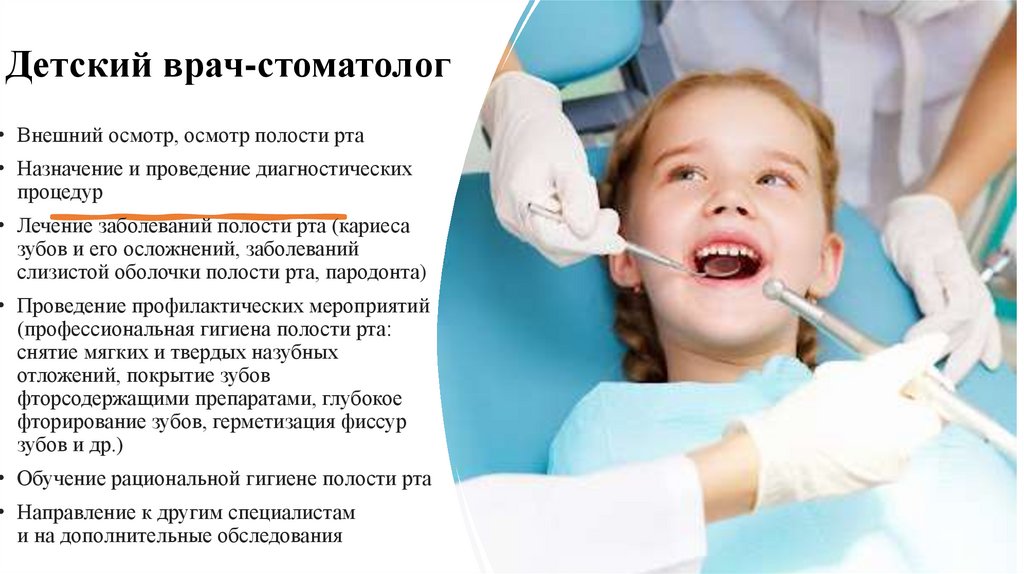Детский врач-стоматолог• Внешний осмотр, осмотр полости рта