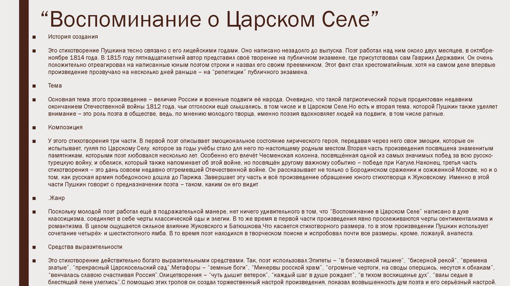 окончанием Отечественной войны 1812 года, чьи отголоски ещё слышались, в том числе и в Царском Селе.Но есть и вторая тема, которой Пушкин также уделяет