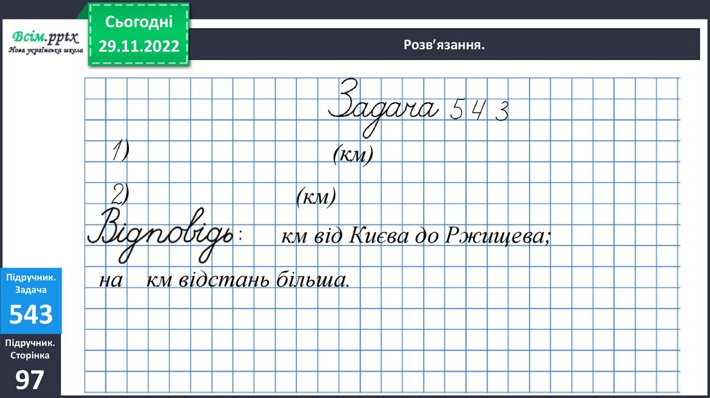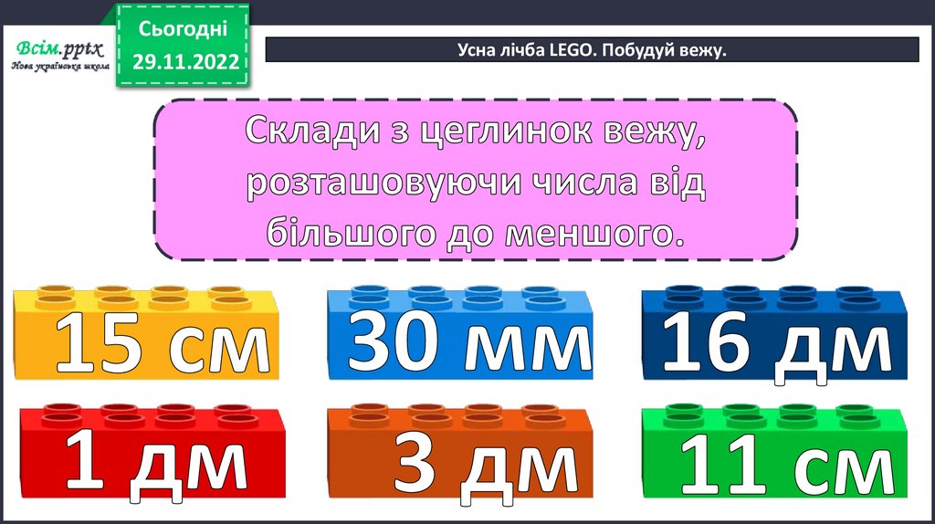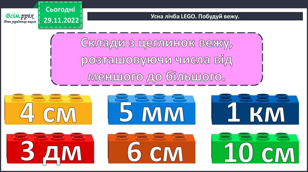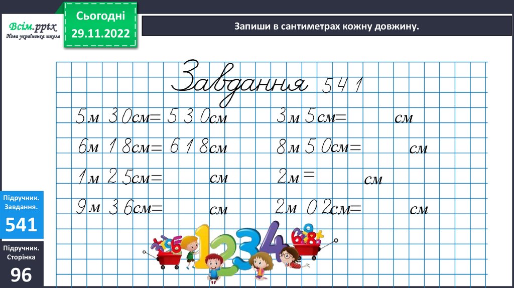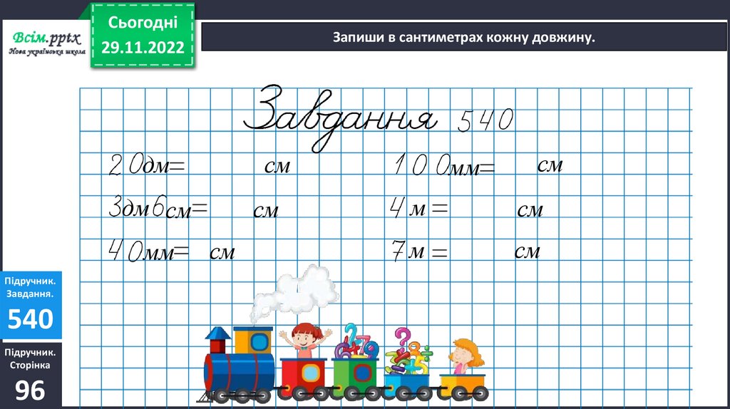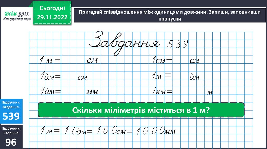 Пригадай співвідношення між одиницями довжини. Запиши, заповнивши