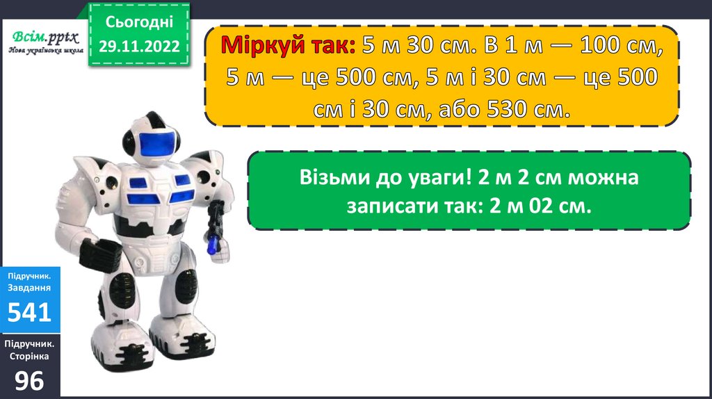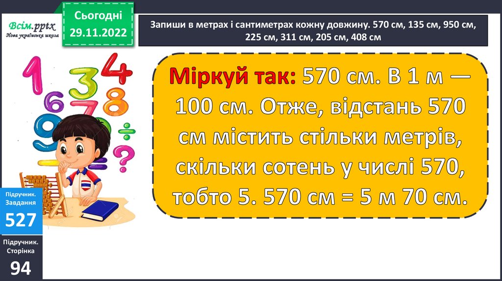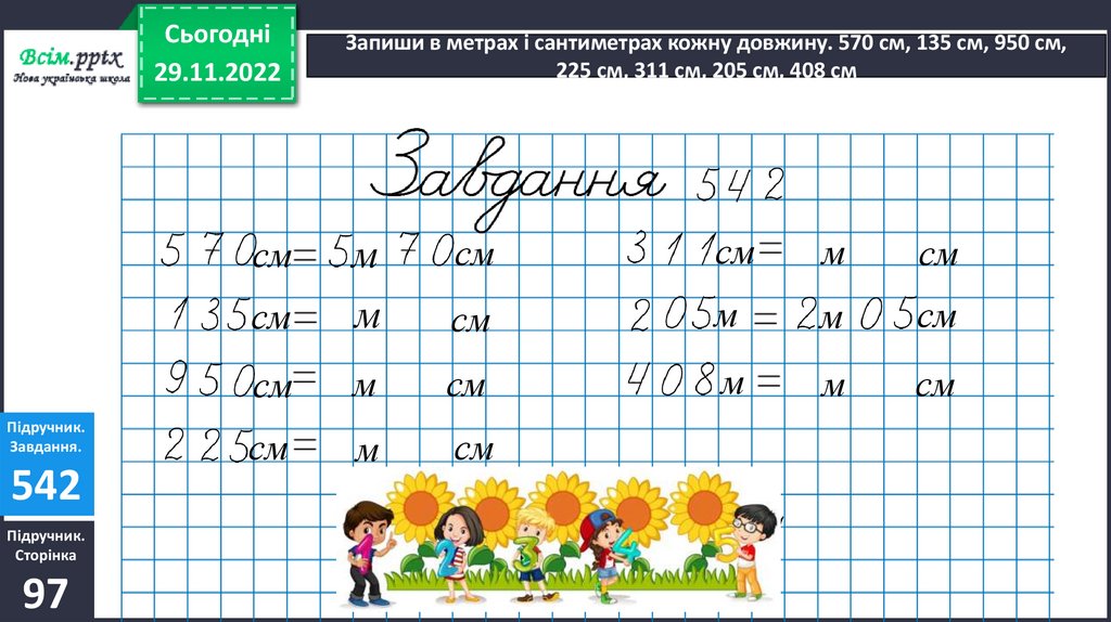 Запиши в метрах і сантиметрах кожну довжину. 570 см, 135 см, 950 см,