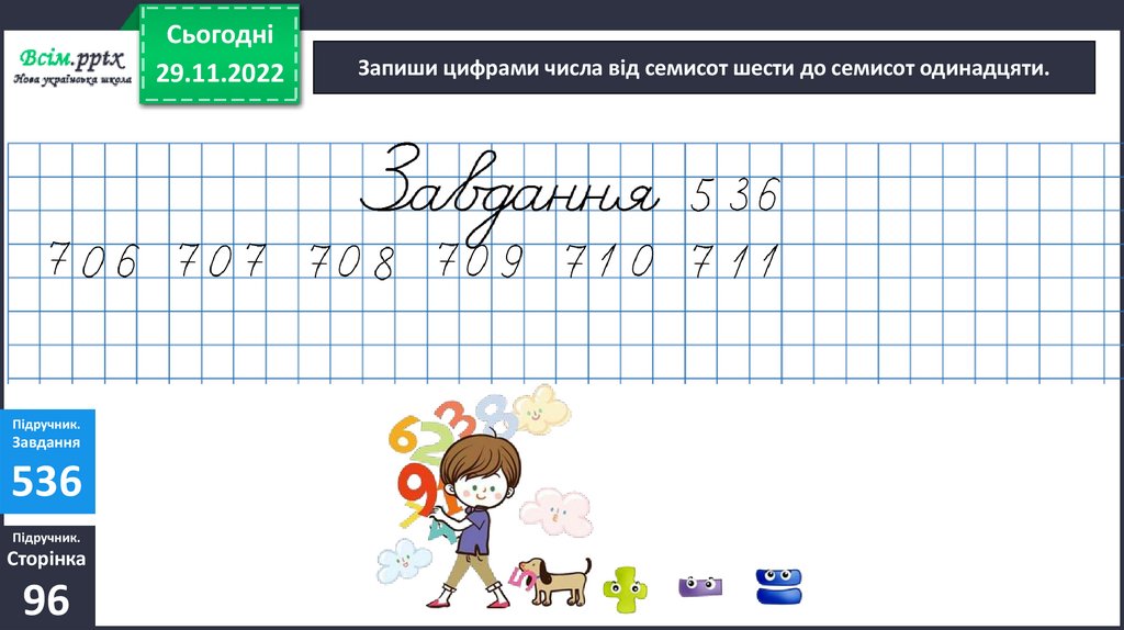 Запиши цифрами числа від семисот шести до семисот одинадцяти.