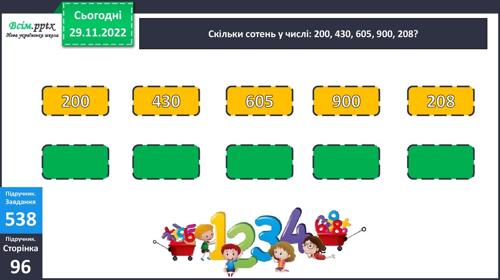 Скільки сотень у числі: 200, 430, 605, 900, 208?