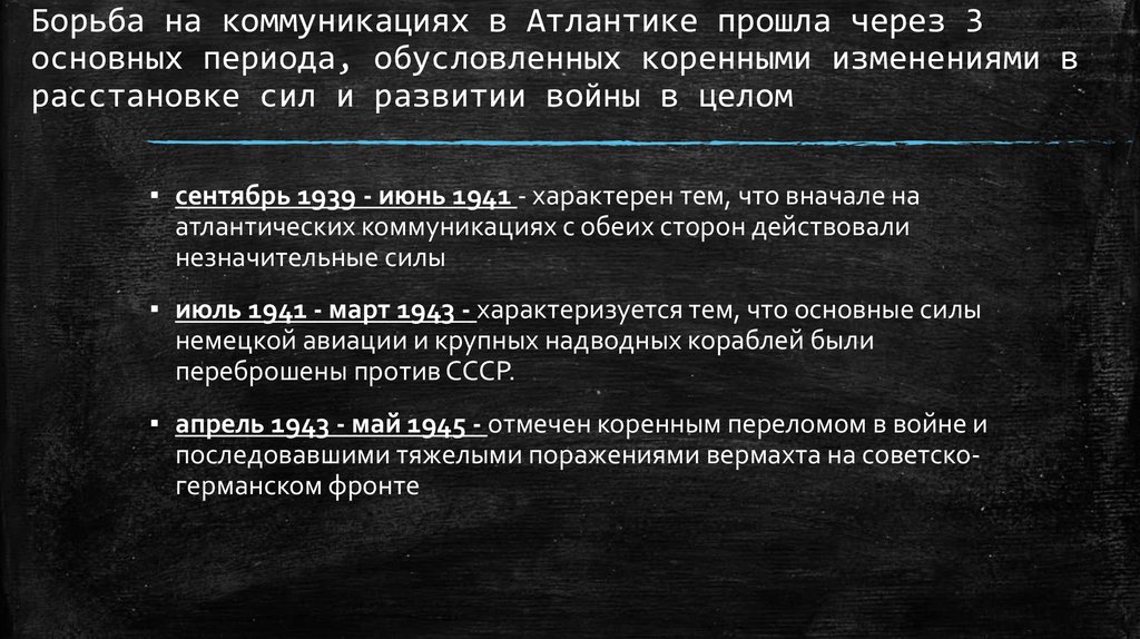 Борьба на коммуникациях в Атлантике прошла через 3основных периода, обусловленных коренными изменениями в