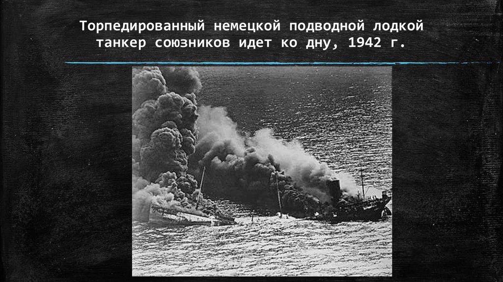 Торпедированный немецкой подводной лодкойтанкер союзников идет ко дну, 1942 г.