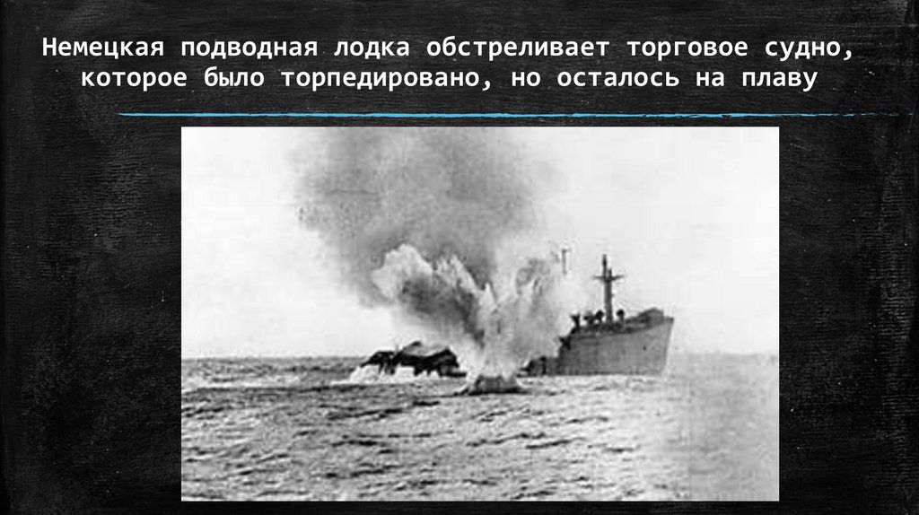 Немецкая подводная лодка обстреливает торговое судно,которое было торпедировано, но осталось на плаву