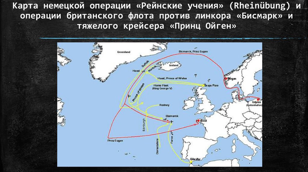 Карта немецкой операции «Рейнские учения» (Rheinübung) иоперации британского флота против линкора «Бисмарк» и