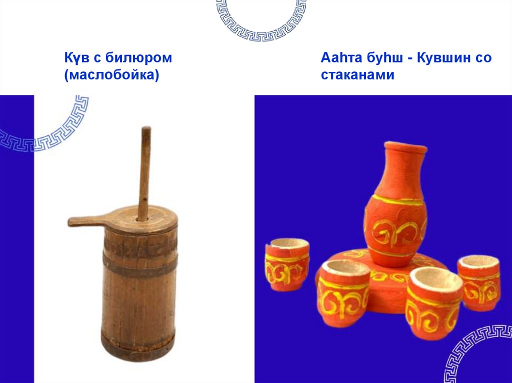 (маслобойка с билюром), тевш (чаша для мяса), стакан.