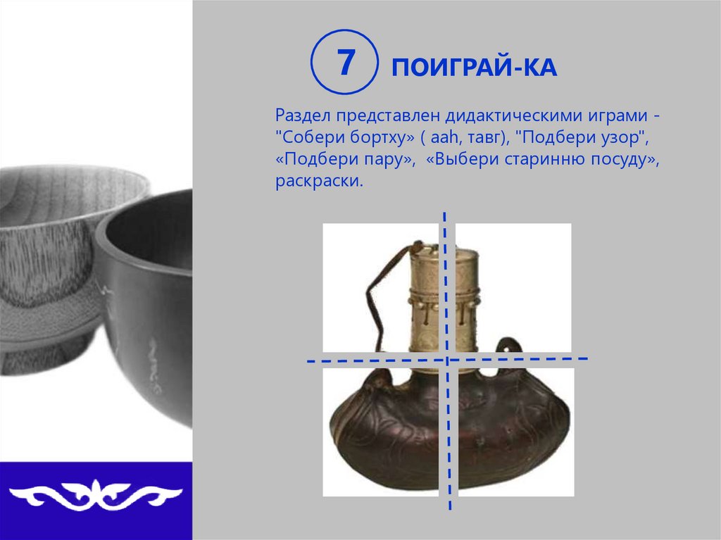 Раздел представлен дидактическими играми "Собери бортху» ( ааh, тавг), "Подбери узор",
