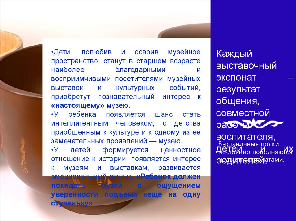 •Дети, полюбив и освоив музейноепространство, станут в старшем возрасте