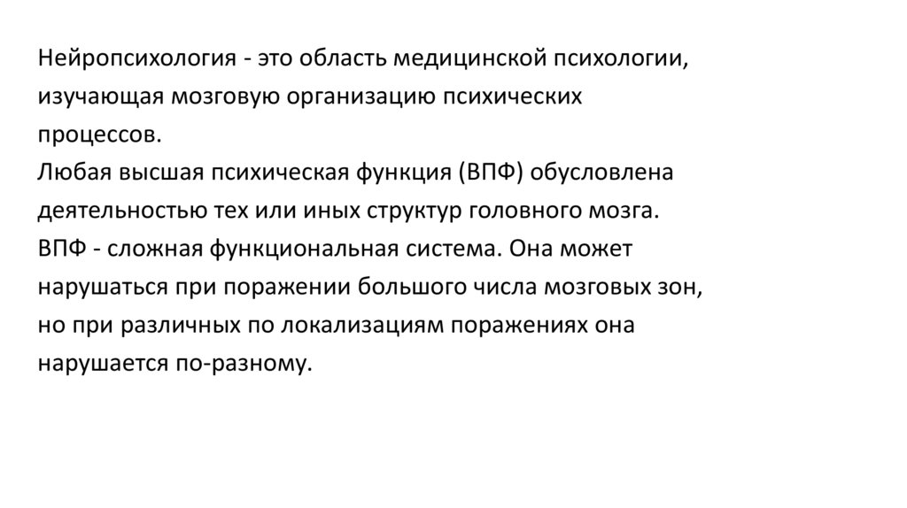 Нейропсихология - это область медицинской психологии,изучающая мозговую организацию психических