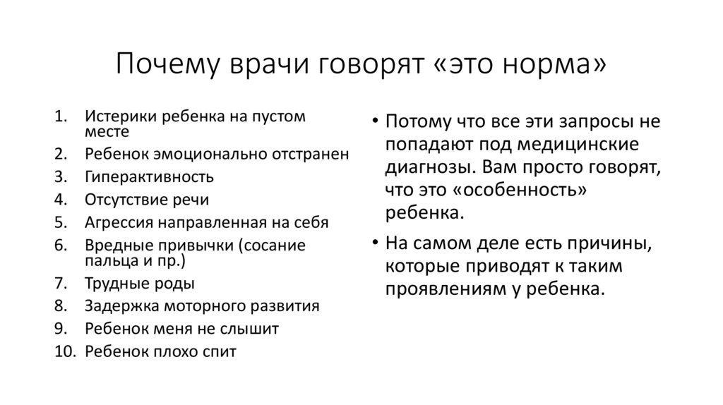 • Почему очень часто специалисты: неврологи, педиатры говорят «Это нормально» (детские истерики,