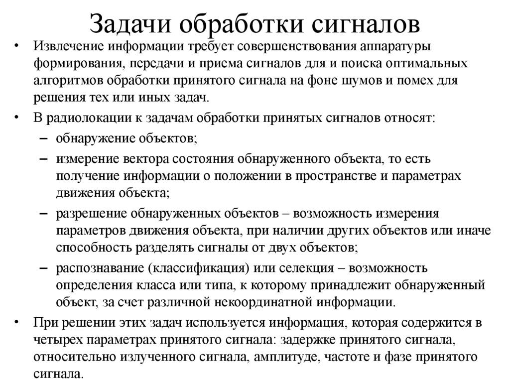 • В радиолокации к задачам обработки принятых сигналов относят:
