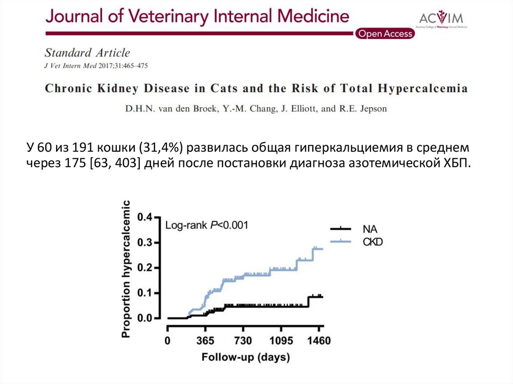 У 60 из 191 кошки (31,4%) развилась общая гиперкальциемия в среднемчерез 175 [63, 403] дней после постановки диагноза азотемической ХБП.