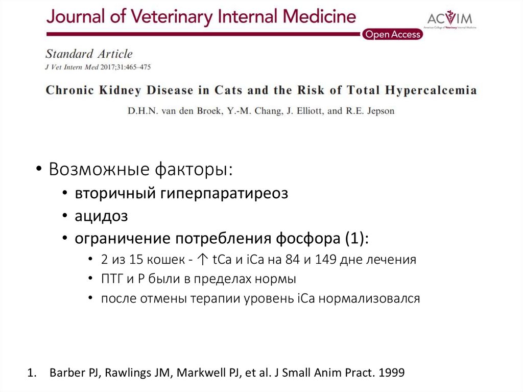 • ХБП обнаружена у 25% кошек с гиперкальциемией (1)