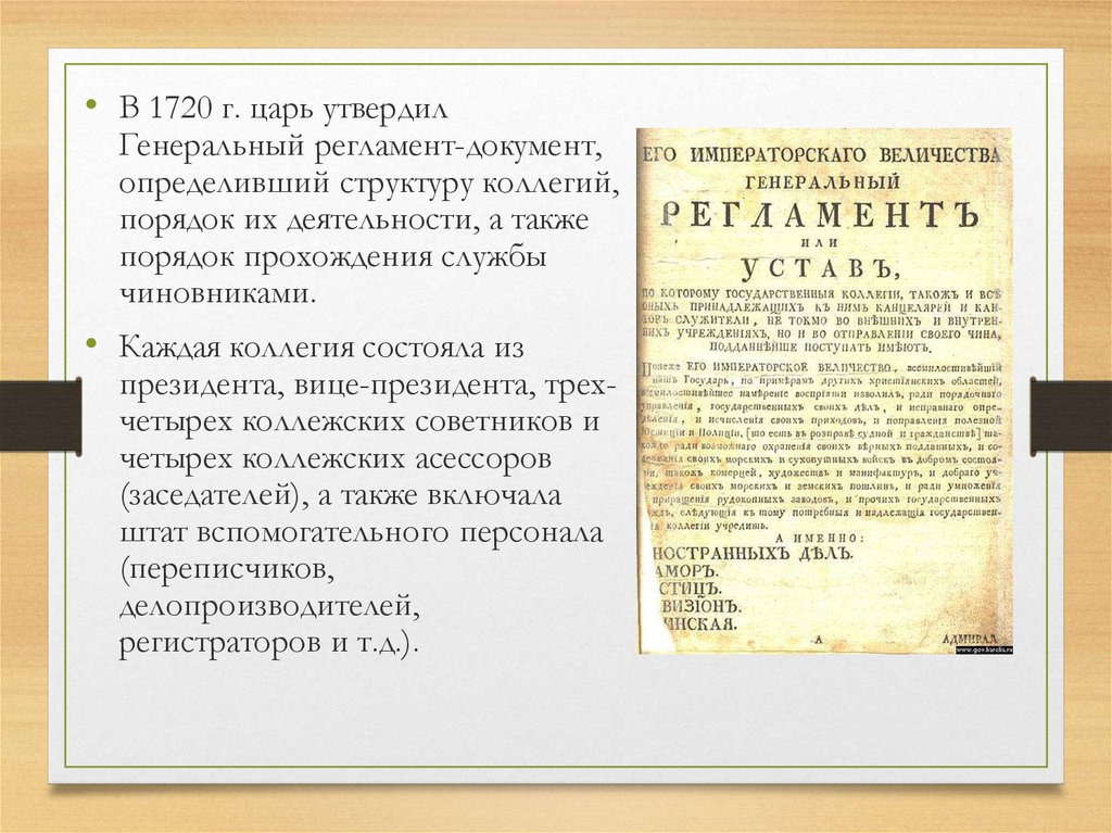 • В 1720 г. царь утвердилГенеральный регламент-документ,
