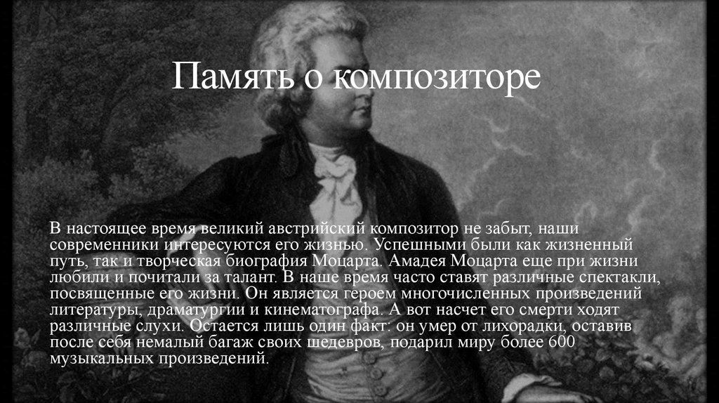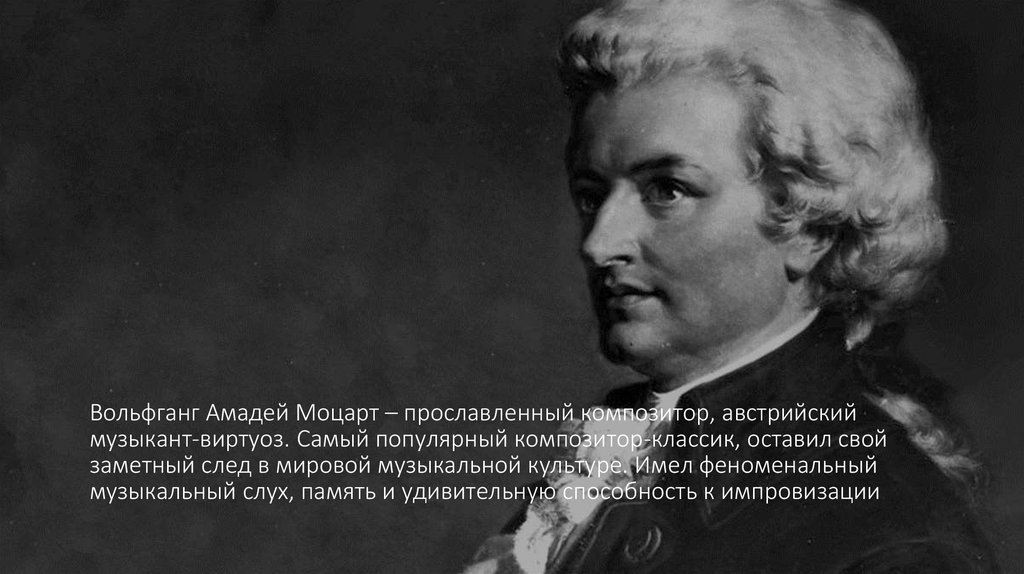 Вольфганг Амадей Моцарт – прославленный композитор, австрийскиймузыкант-виртуоз. Самый популярный композитор-классик, оставил свой