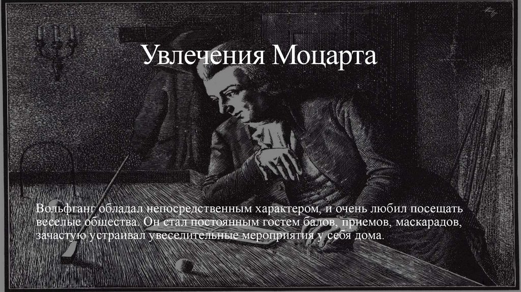 Увлечения МоцартаВольфганг обладал непосредственным характером, и очень любил посещать