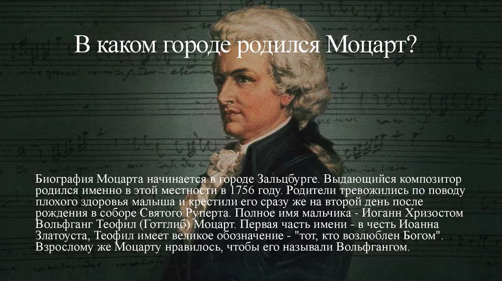 В каком городе родился Моцарт?Биография Моцарта начинается в городе Зальцбурге. Выдающийся композитор