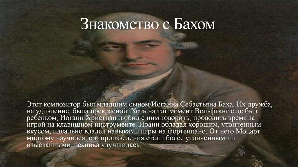 Знакомство с БахомЭтот композитор был младшим сыном Иоганна Себастьяна Баха. Их дружба,
