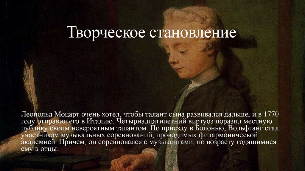 Творческое становлениеЛеопольд Моцарт очень хотел, чтобы талант сына развивался дальше, и в 1770