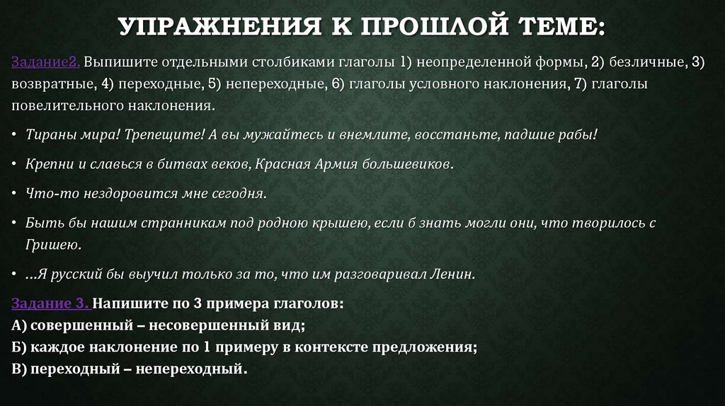 УПРАЖНЕНИЯ К ПРОШЛОЙ ТЕМЕ:Задание2. Выпишите отдельными столбиками глаголы 1) неопределенной формы, 2) безличные, 3)