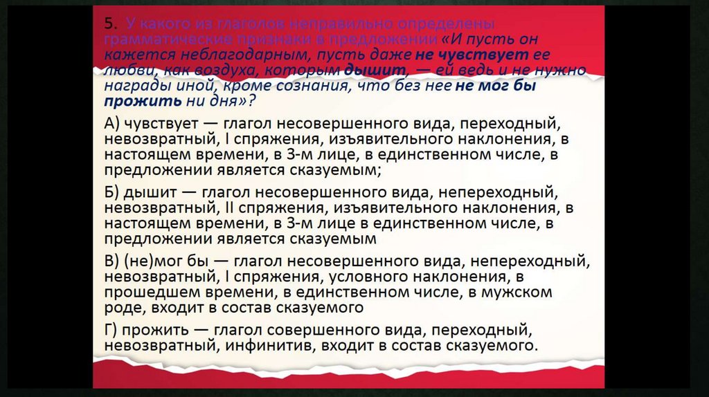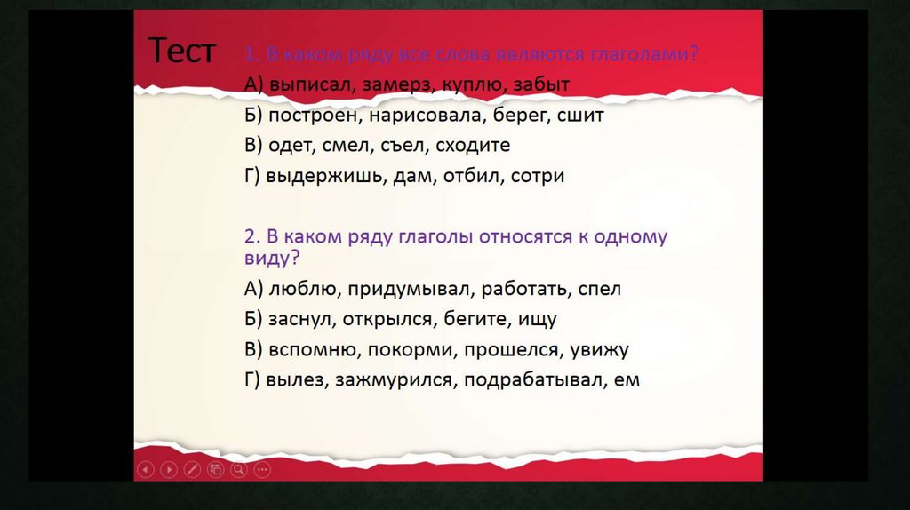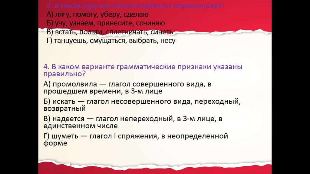 возвратные, 4) переходные, 5) непереходные, 6) глаголы условного наклонения, 7) глаголы