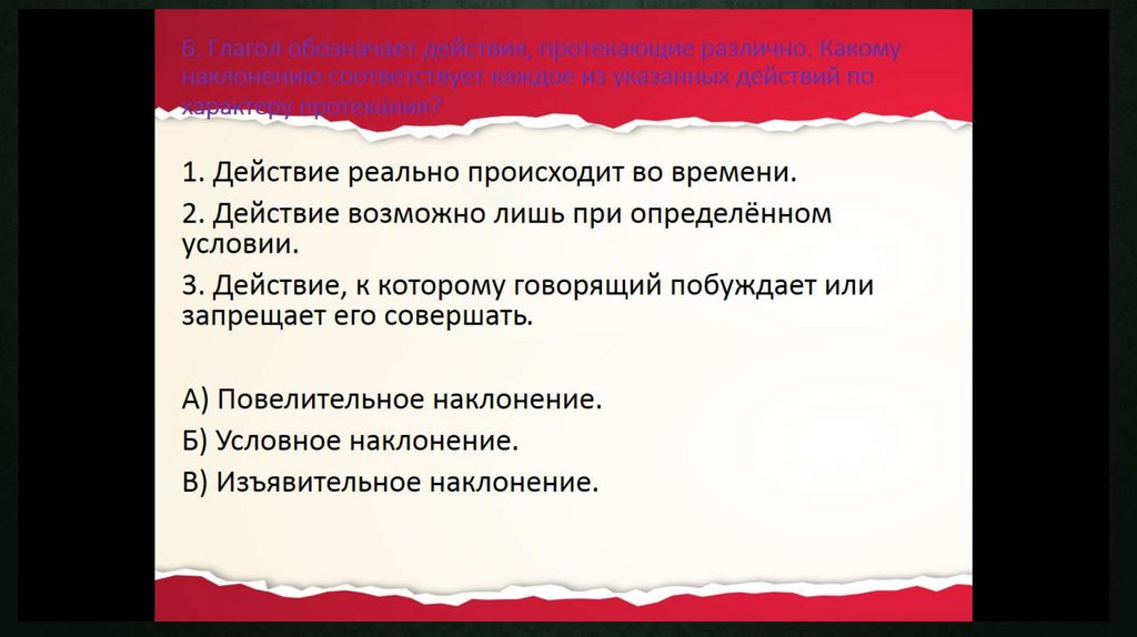 Б) каждое наклонение по 1 примеру в контексте предложения;