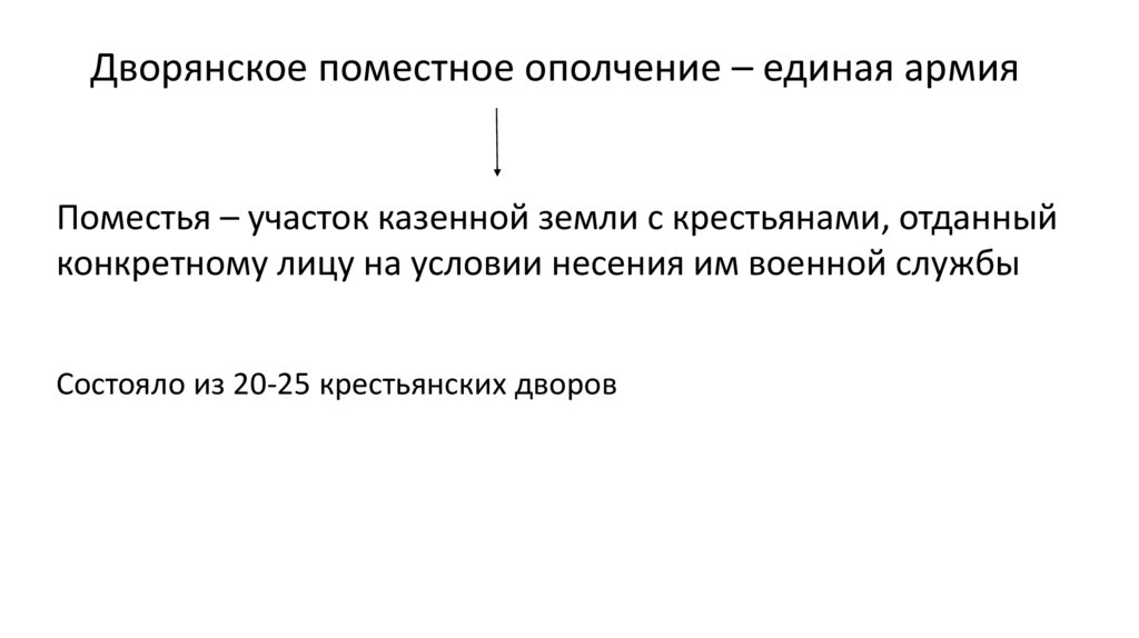 Дворянское поместное ополчение – единая армияПоместья – участок казенной земли с крестьянами, отданный