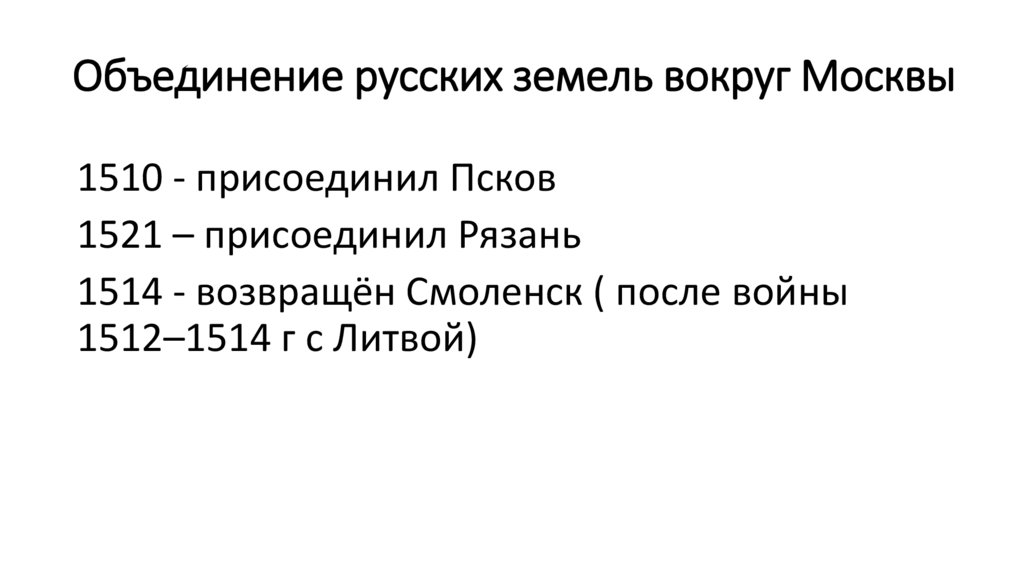 Объединение русских земель вокруг Москвы1510 - присоединил Псков