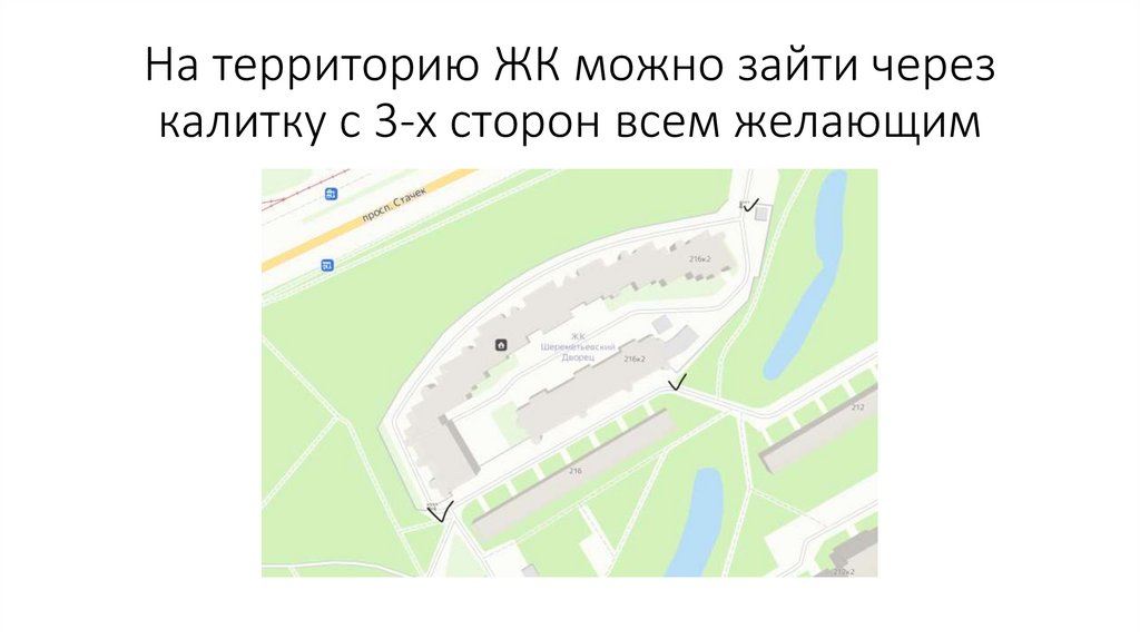 На территорию ЖК можно зайти черезкалитку с 3-х сторон всем желающим