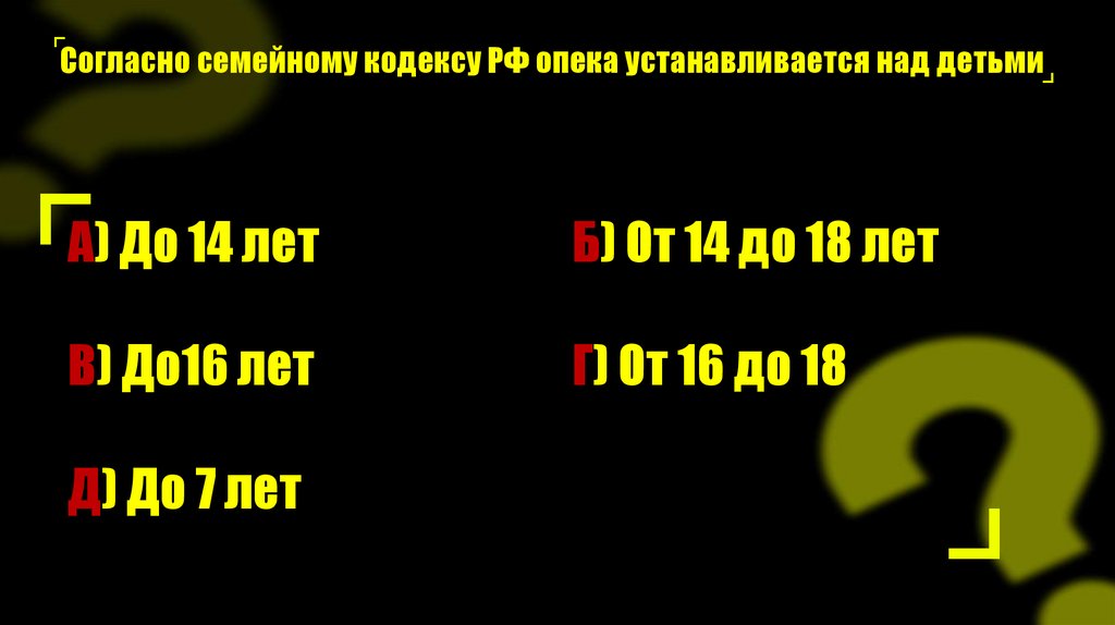 Согласно семейному кодексу РФ опека устанавливается над детьмиА) До 14 лет