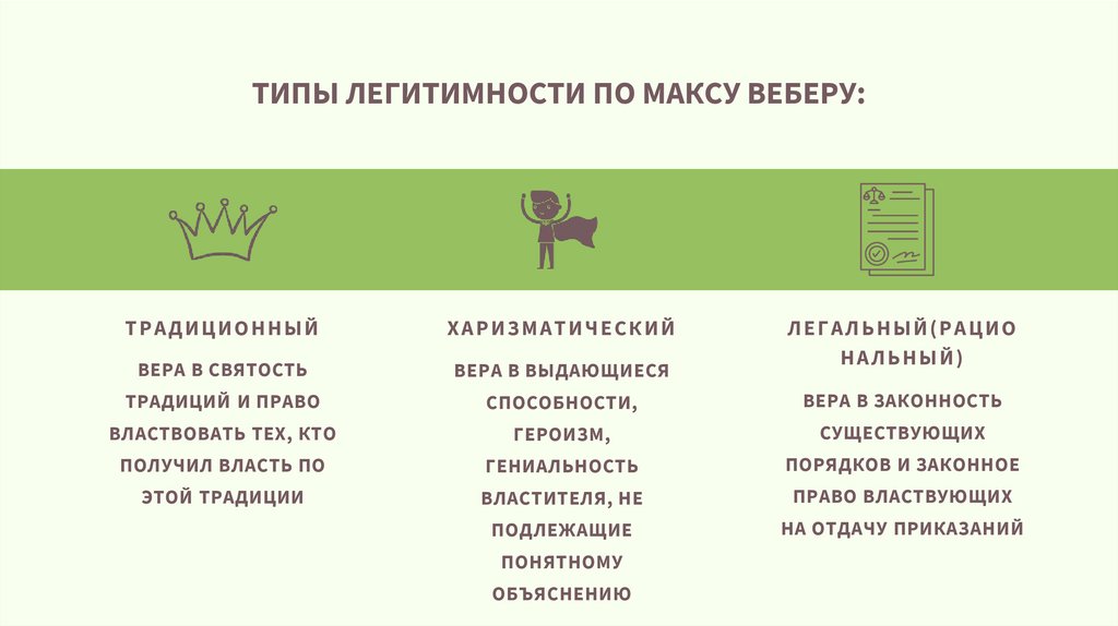 ТИПЫ ЛЕГИТИМНОСТИ ПО МАКСУ ВЕБЕРУ:Т Р А Д И Ц И О Н Н Ы Й