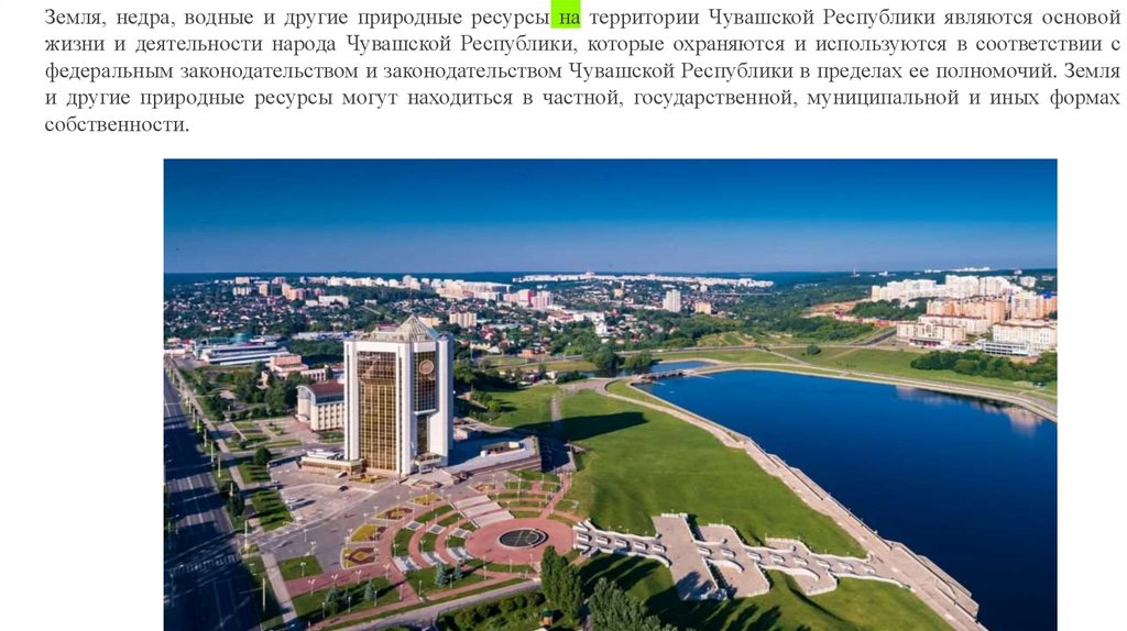 Земля, недра, водные и другие природные ресурсы на территории Чувашской Республики являются основойжизни и деятельности народа Чувашской Республики, которые охраняются и используются в соответствии с