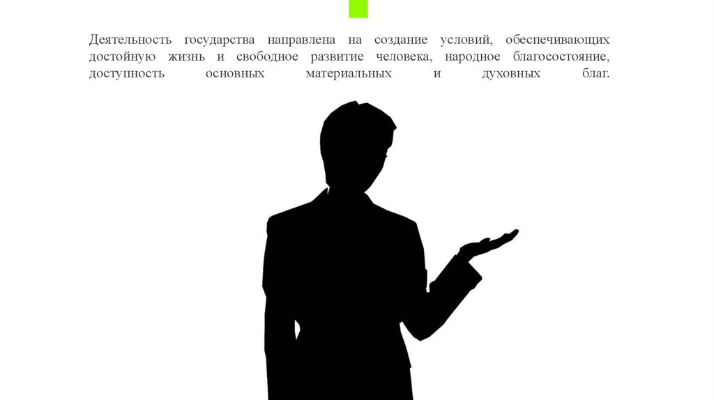 Деятельность государства направлена на создание условий, обеспечивающихдостойную жизнь и свободное развитие человека, народное благосостояние,