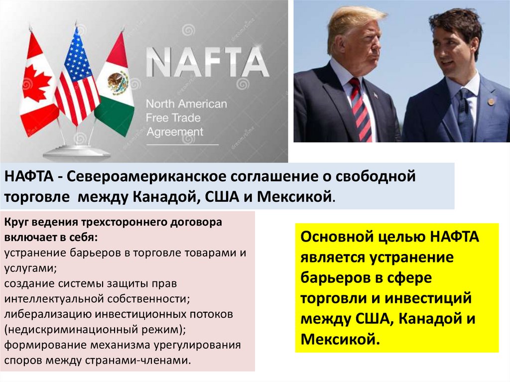 НАФТА - Североамериканское соглашение о свободнойторговле между Канадой, США и Мексикой.